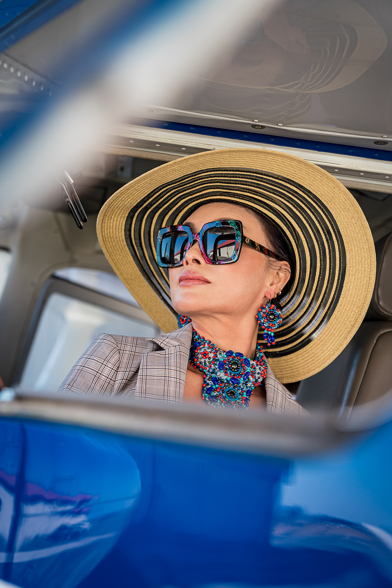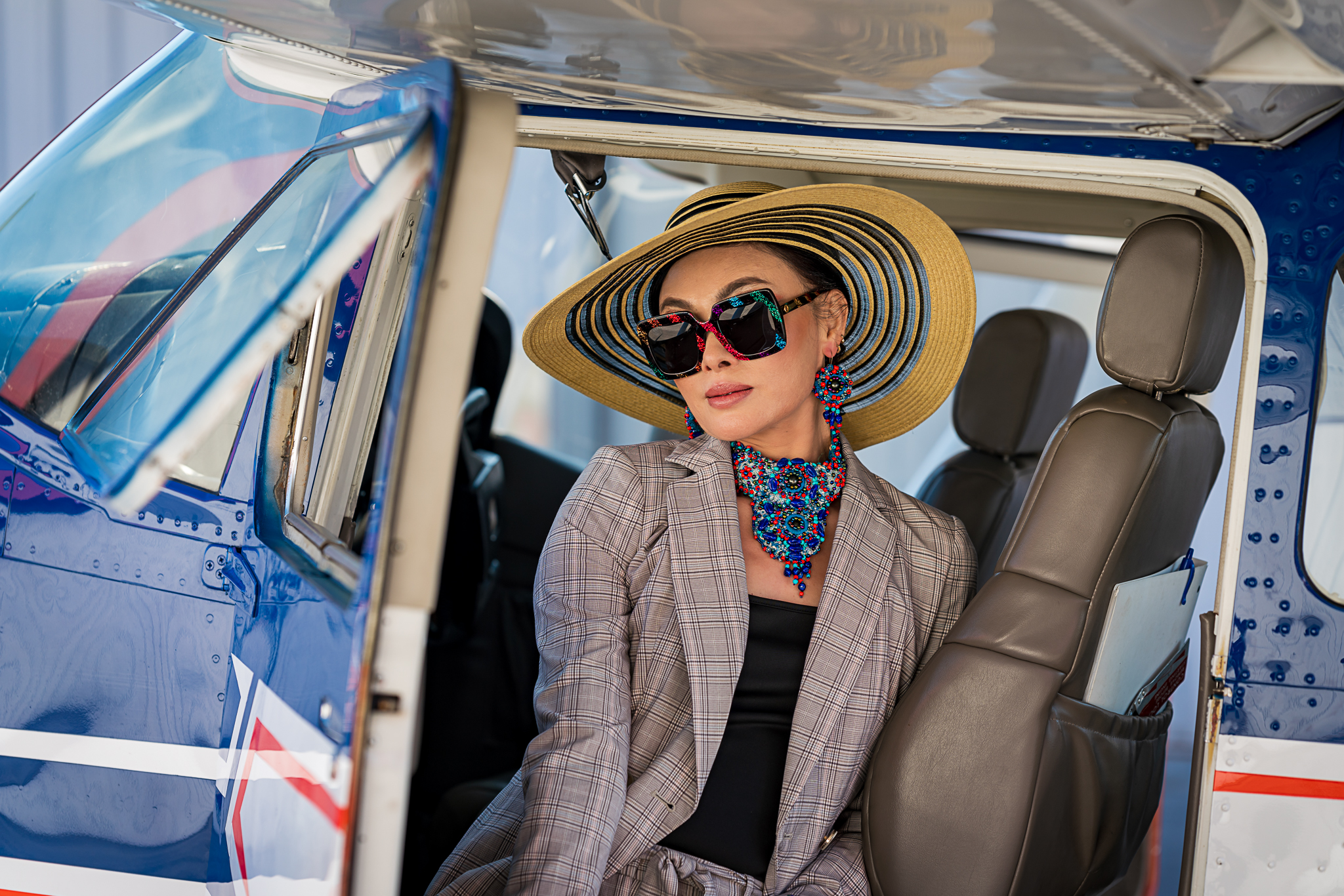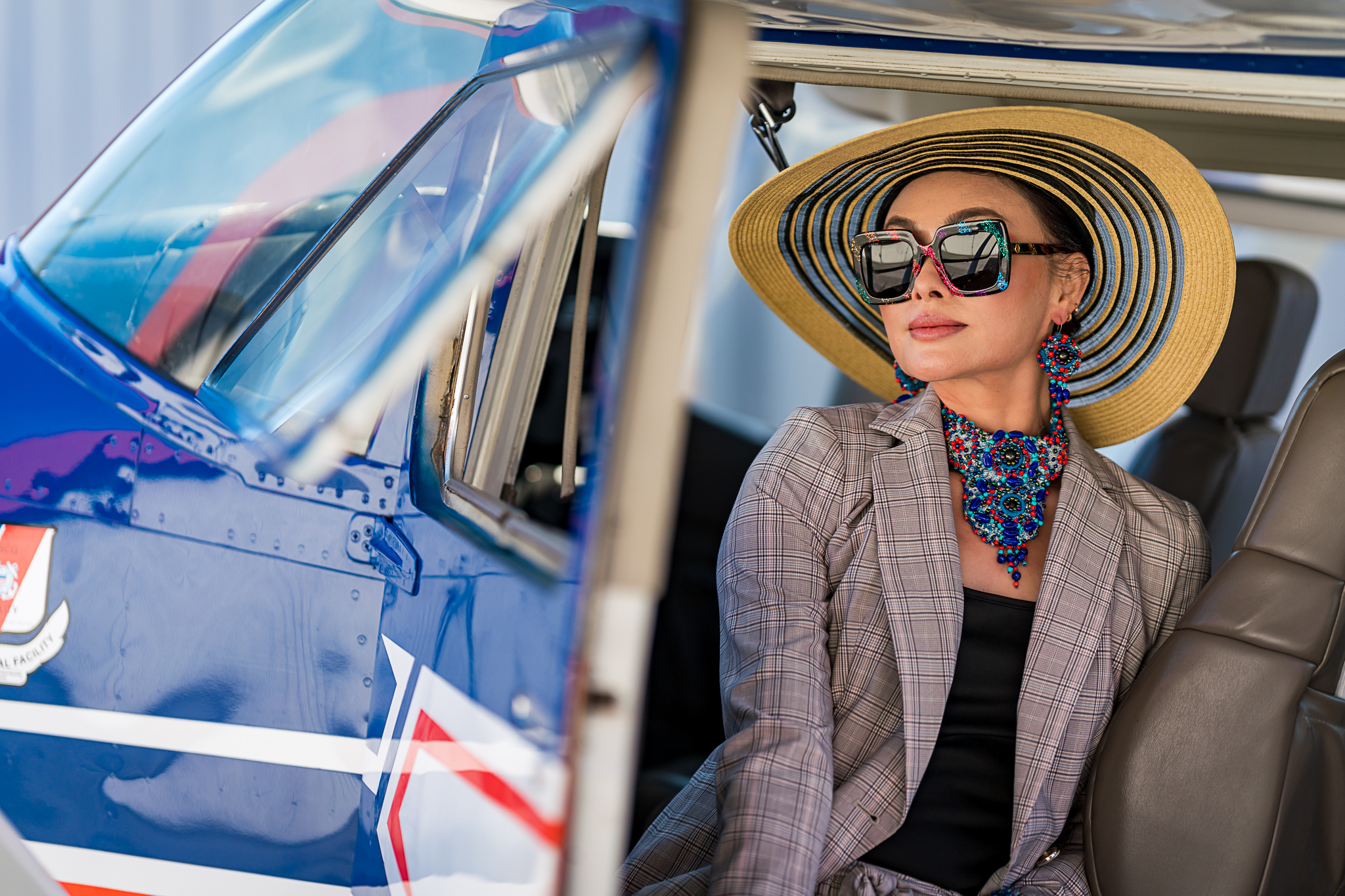 The creative director behind this photoshoot is Miae Nelson, an art fashion jewelry designer who envisioned an innovative way to showcase her remarkable and distinctive pieces. Working alongside her team, and Sebastien Belanger, who hosted the event, the group created a unique and captivating concept that blended the allure of an airfield with the elegance of high fashion.