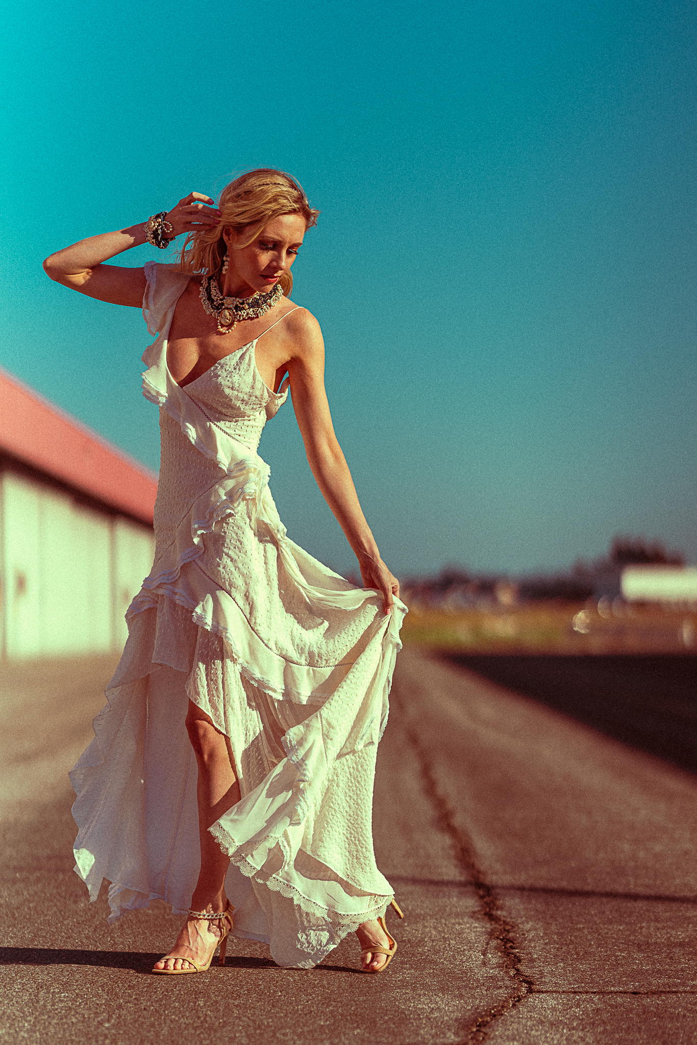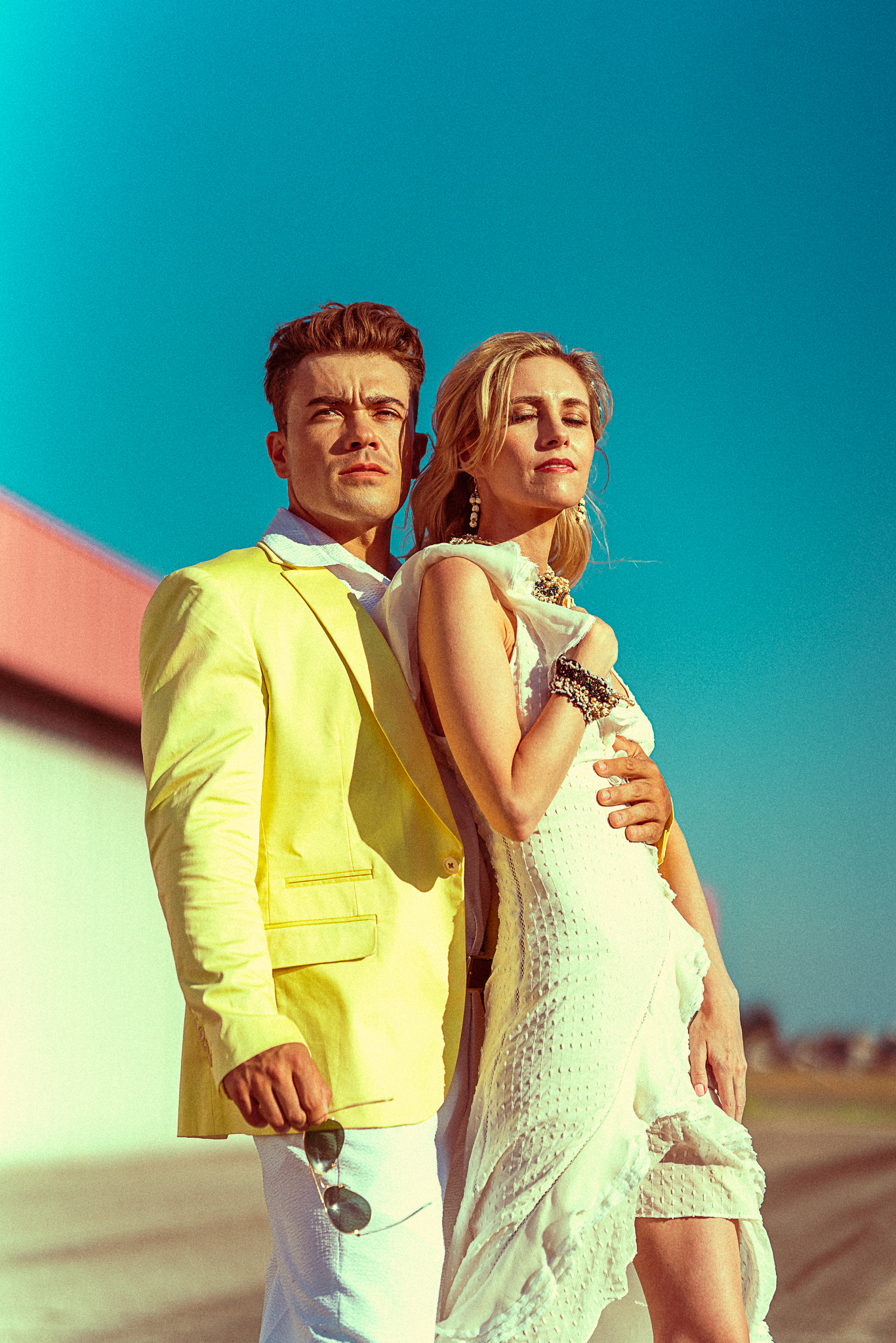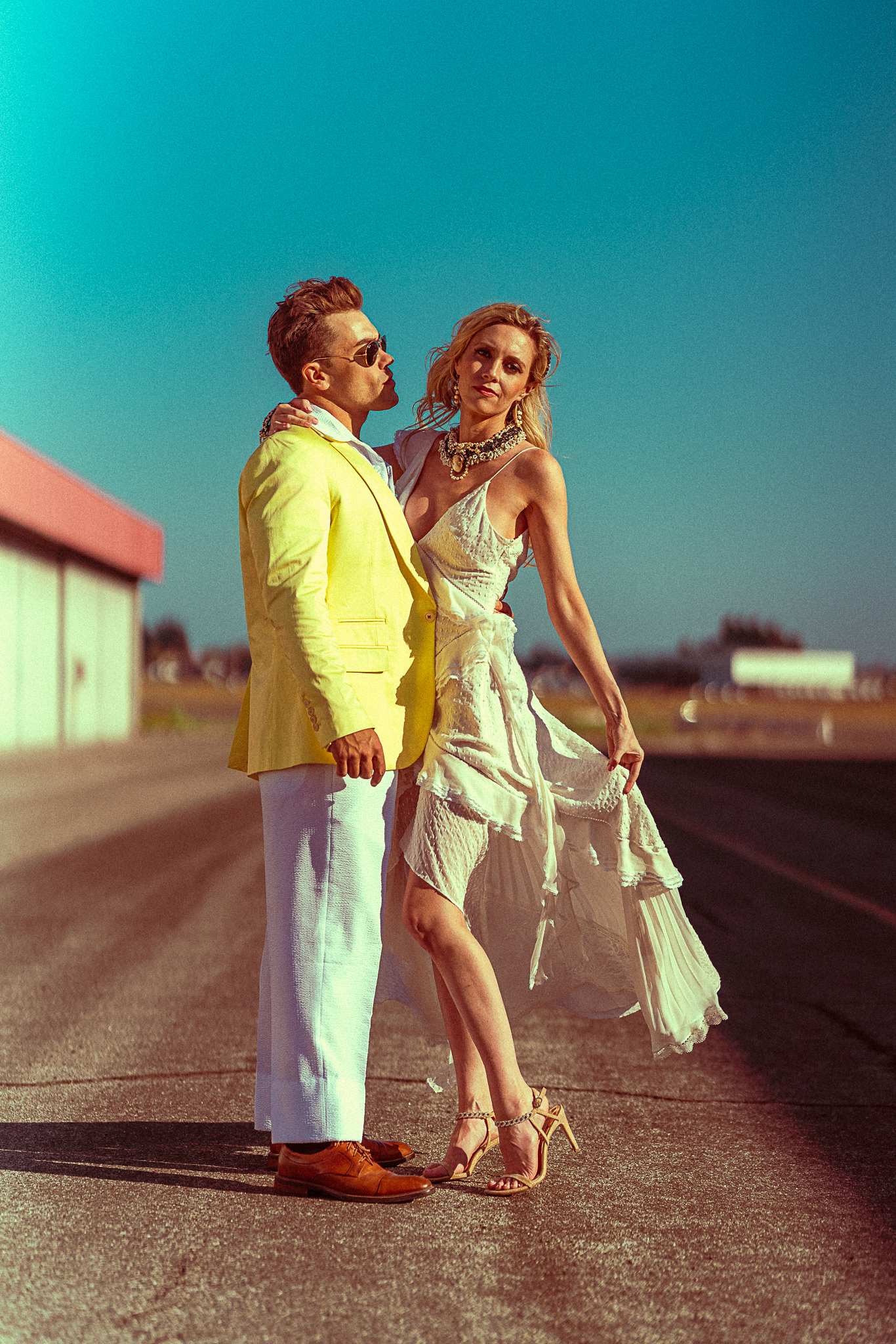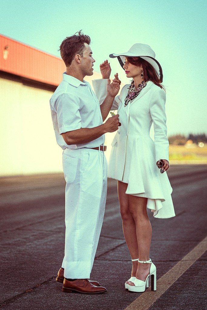 Golden hour casts its enchanting glow over Jamie Lee Kendall and Pat Uland, turning the tarmac into their stage. Pat’s bold yellow blazer radiates confidence, while Jamie’s flowing white dress flirts with the breeze, inviting the promise of adventure. Their poised gazes hint at untold stories of glamorous departures and daring arrivals. This moment feels suspended in time, capturing airports as places where elegance, fashion, and the anticipation of a journey converge.