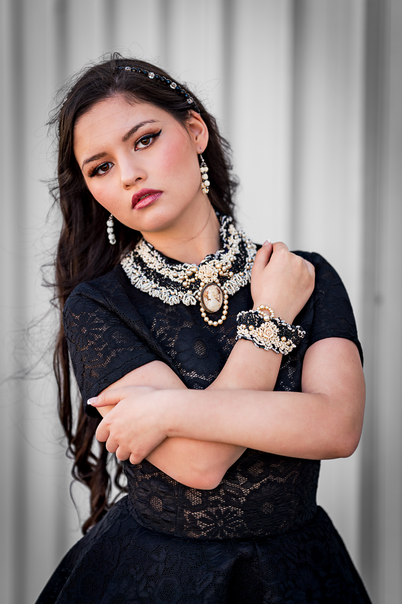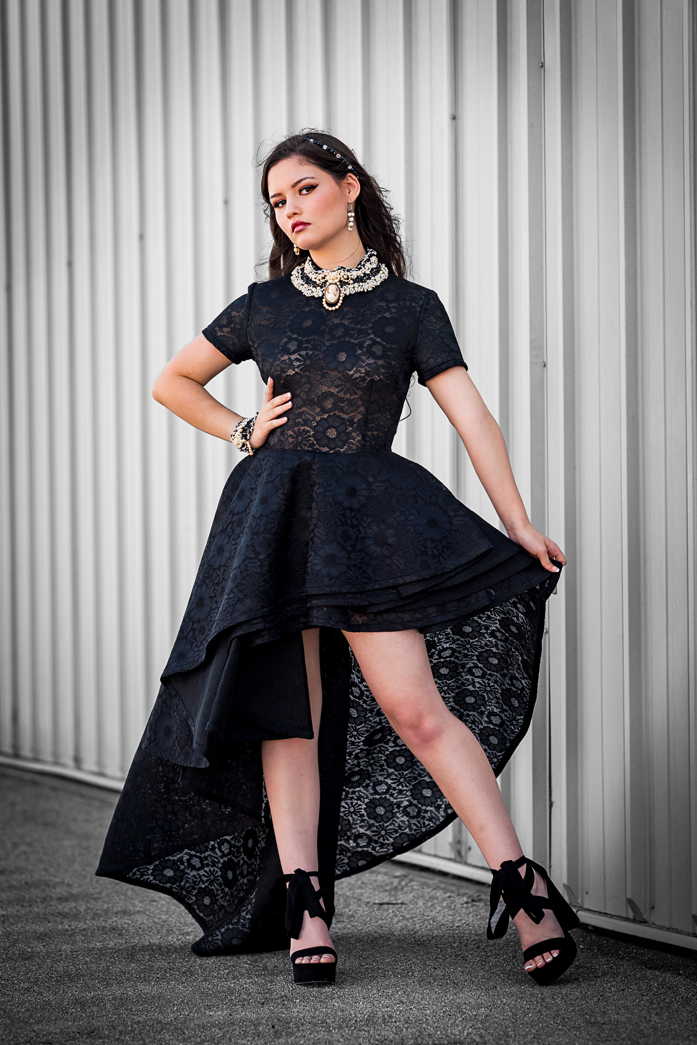 Amanda Gwen Crawford stands poised against a metallic backdrop, her black lace gown bringing a dramatic elegance to the scene. The grounded propeller, a relic of flight, contrasts with her commanding presence, weaving a narrative of resilience and aspiration. Her expression tells a story of bold ambition, transforming the industrial setting into a canvas of strength and grace. This scene captures the duality of grounded beauty and the dream of soaring beyond limits.