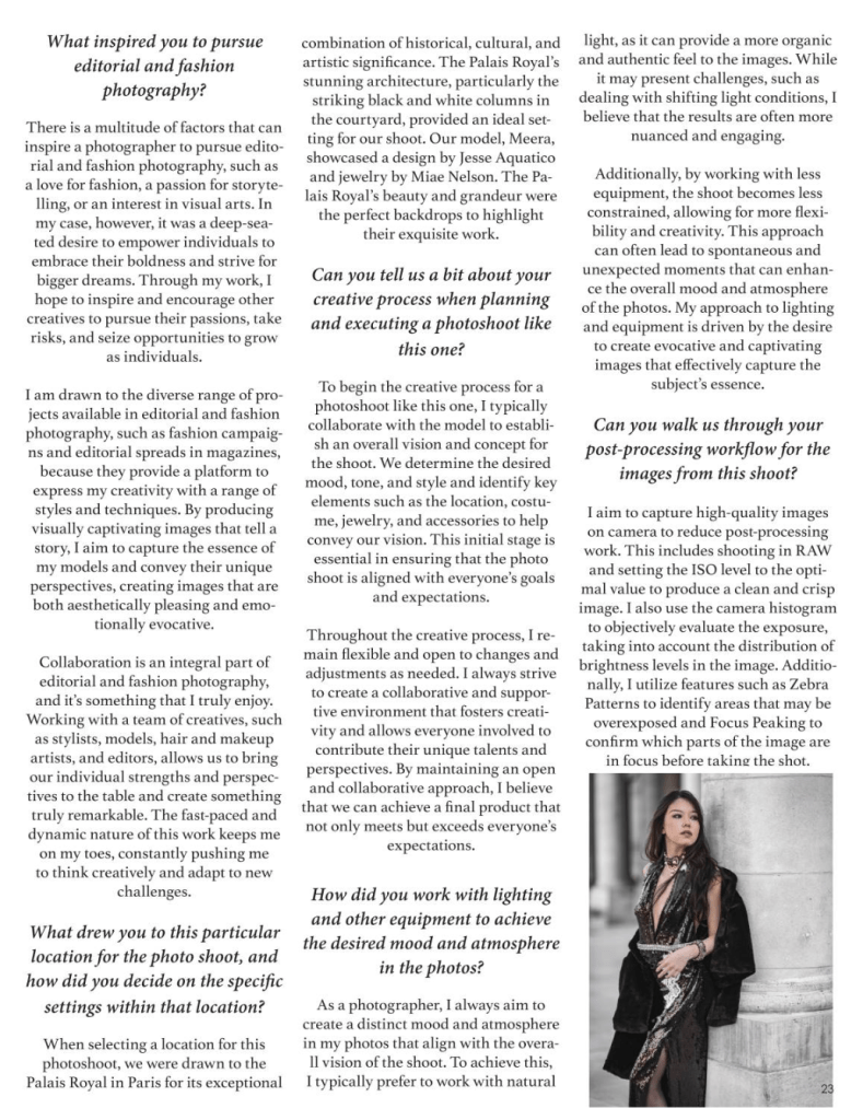 Collaboration is an integral part of editorial and fashion photography, and it’s something that I truly enjoy. Working with a team of creatives, such as stylists, models, hair and makeup artists, and editors, allows us to bring our individual strengths and perspectives to the table and create something truly remarkable. The fast-paced and dynamic nature of this work keeps me on my toes, constantly pushing me to think creatively and adapt to new challenges.