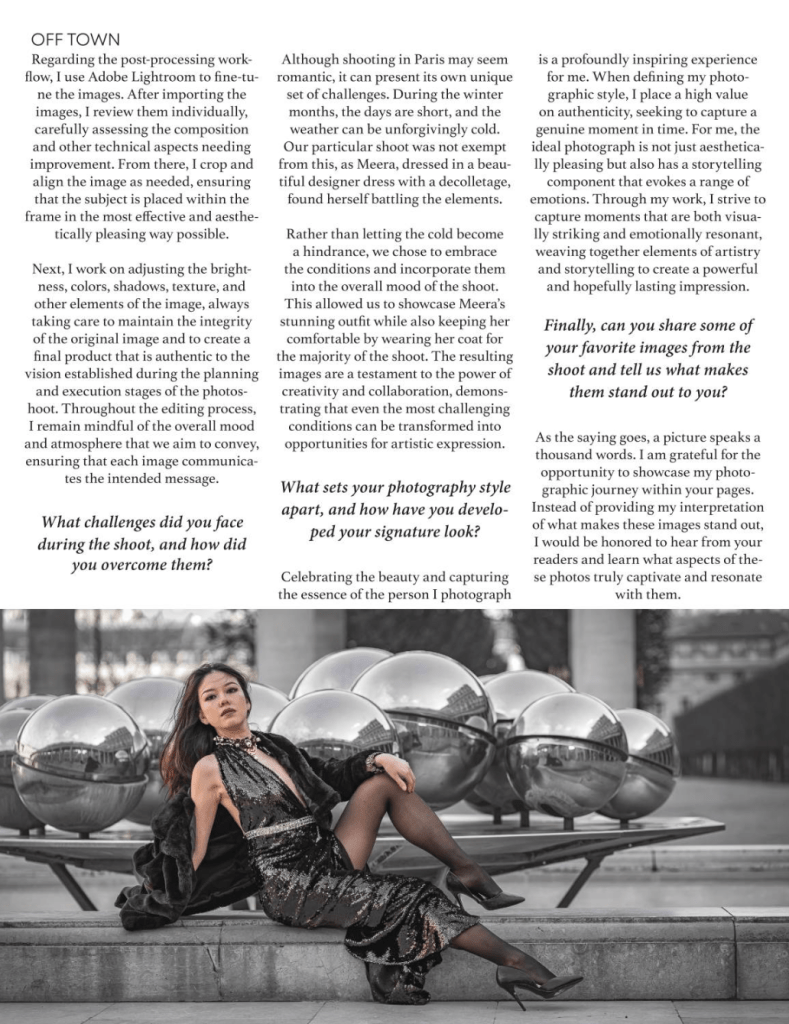 I feel incredibly grateful for the opportunity to share my journey as a photographer in the realms of fashion and editorial photography in this interview with Off Town Magazine. It has been a humbling experience to work alongside so many talented creatives. In this exclusive feature, I’d like to invite you behind the scenes to explore my inspirations and some of the lessons I learned along the way. It’s through these experiences that I’ve come to appreciate the true beauty of fashion and the ever-evolving art of editorial photography.
