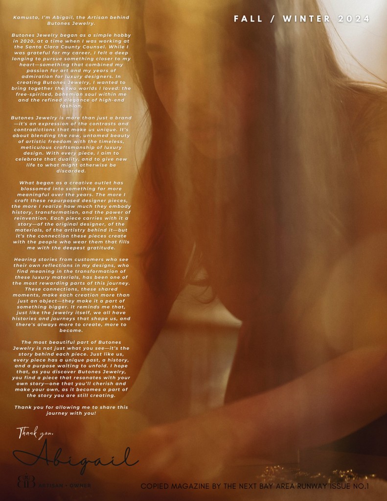 When I flipped through the inaugural issue of COPIED Magazine by The Next Bay Area Runway, I was hit with the best kind of surprise, my photos of the latest Butones Jewelry collection were featured! It was one of those pinch-me moments. As someone who loves creative collaborations, seeing this work showcased was a thrill, especially since this jewelry line is as inspiring as it is gorgeous.