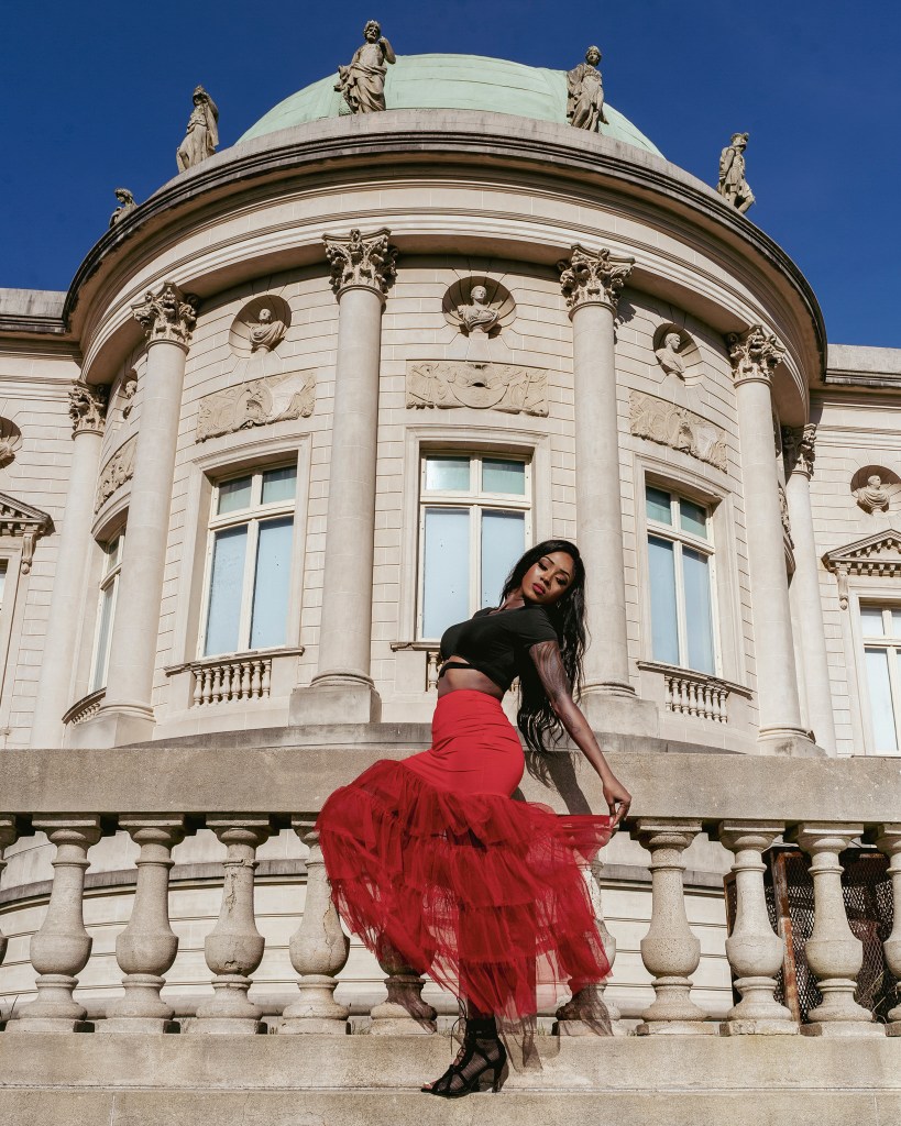 The Legion of Honor offered a powerful setting. Its grand architecture and sweeping columns mirrored Laia’s quiet strength. Wearing a bold red and black dress, she moved with confidence and ease. Her posture and presence reflected her deep connection to Spanish culture and her experience as a model and mentor. Nothing about her energy felt forced. She was beautiful and self-assured.