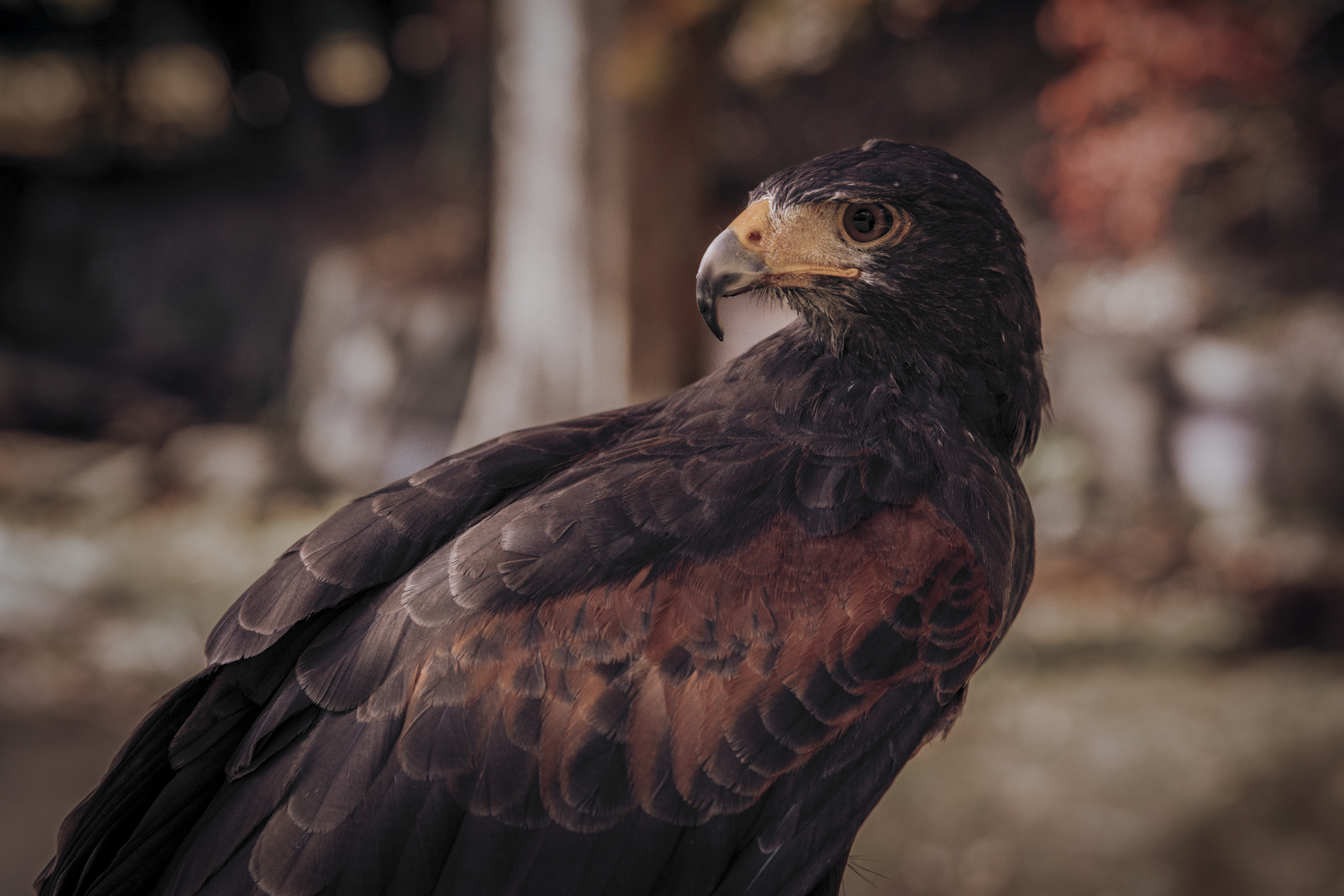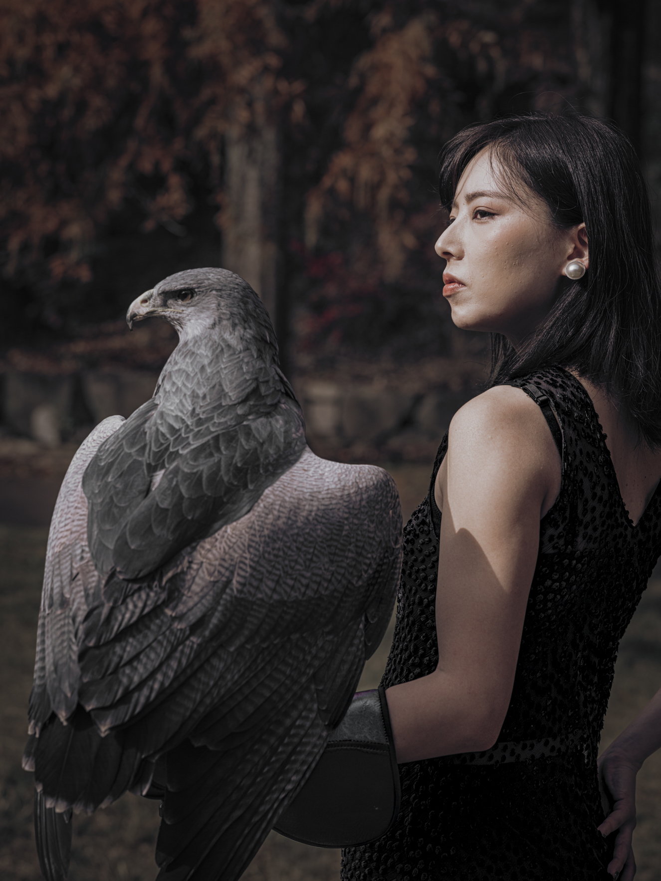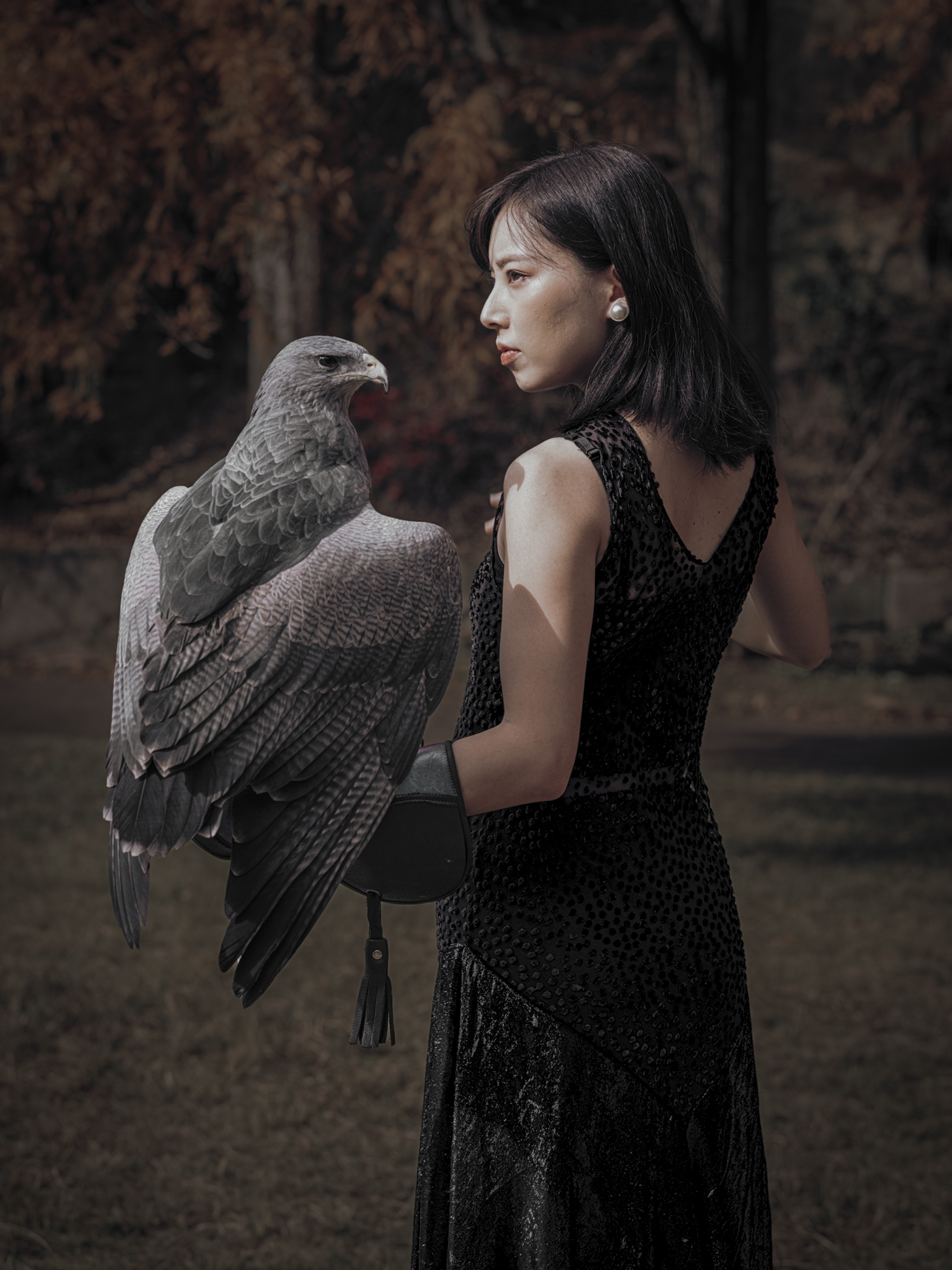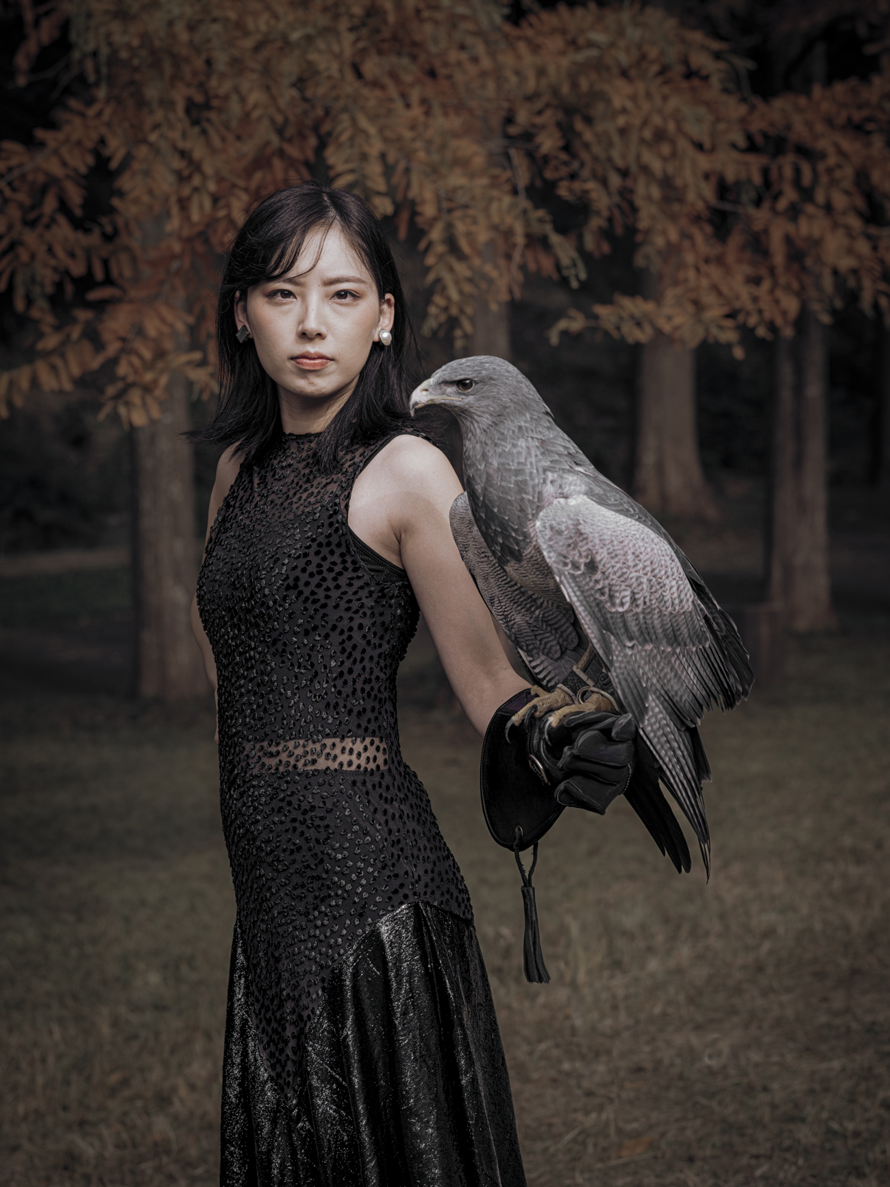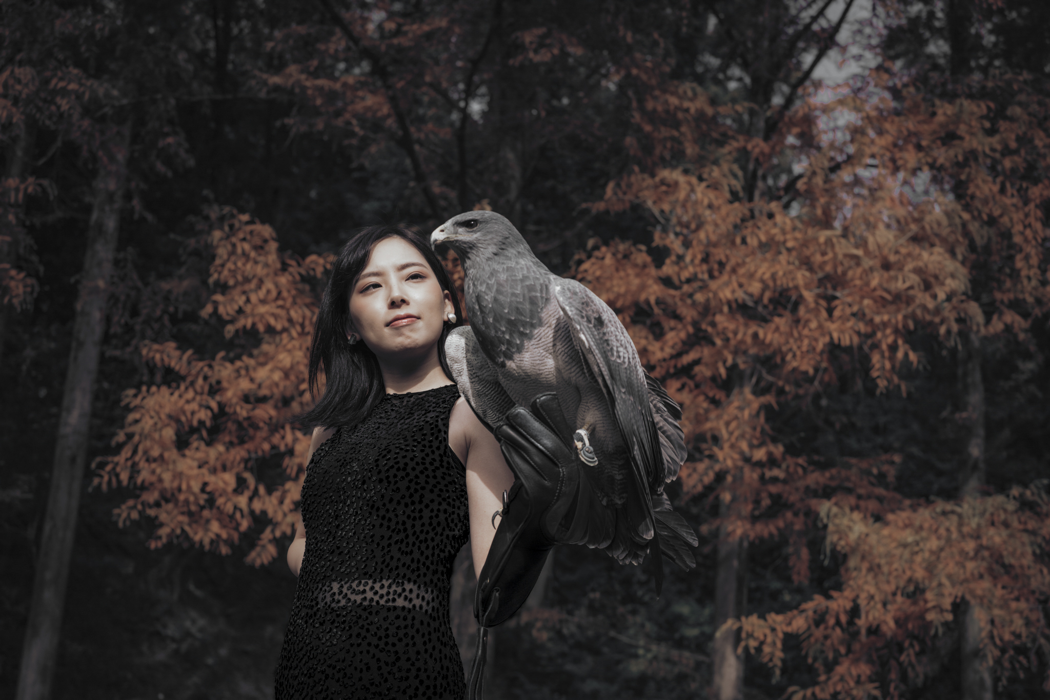 That feeling shaped this shoot in Komyoike, just outside Osaka. Surrounded by trees and softened light, the space felt contained, almost inward. Kaori arrived grounded and calm, inviting her friend Hiro to bring two of his birds into the story. An eagle and a hawk.